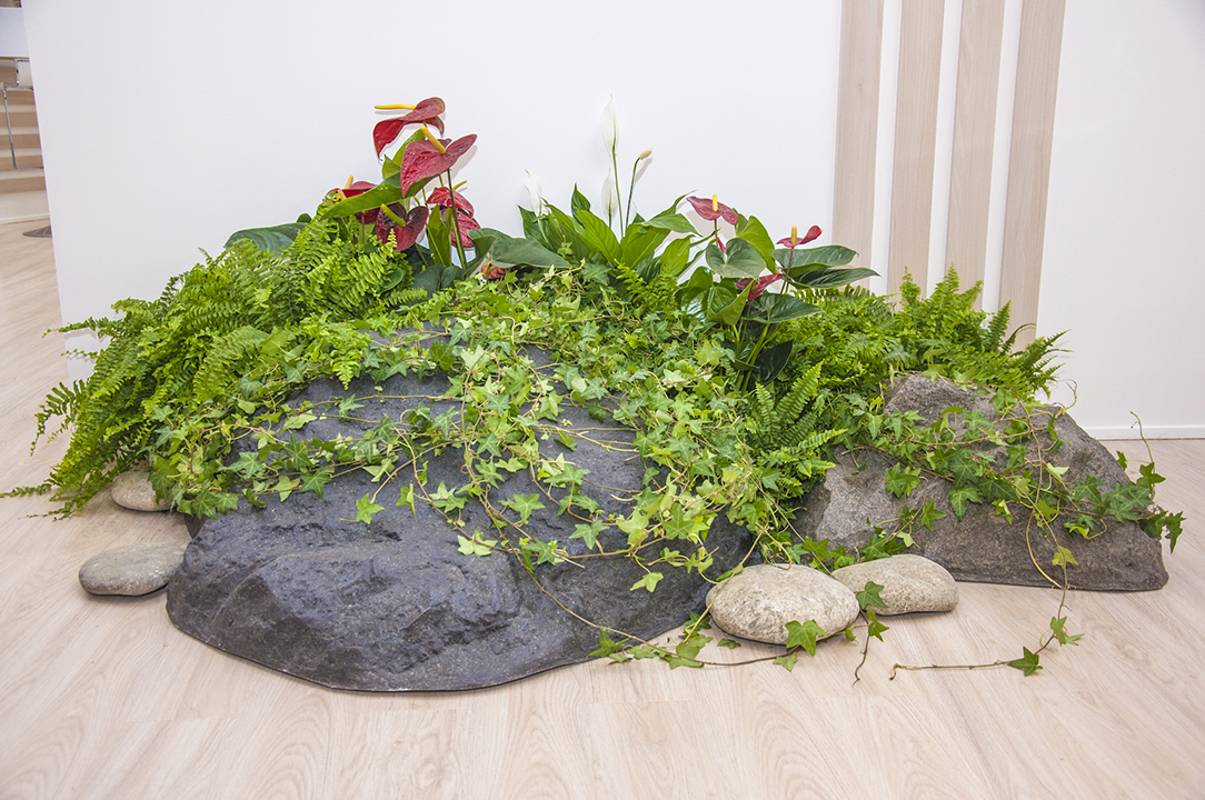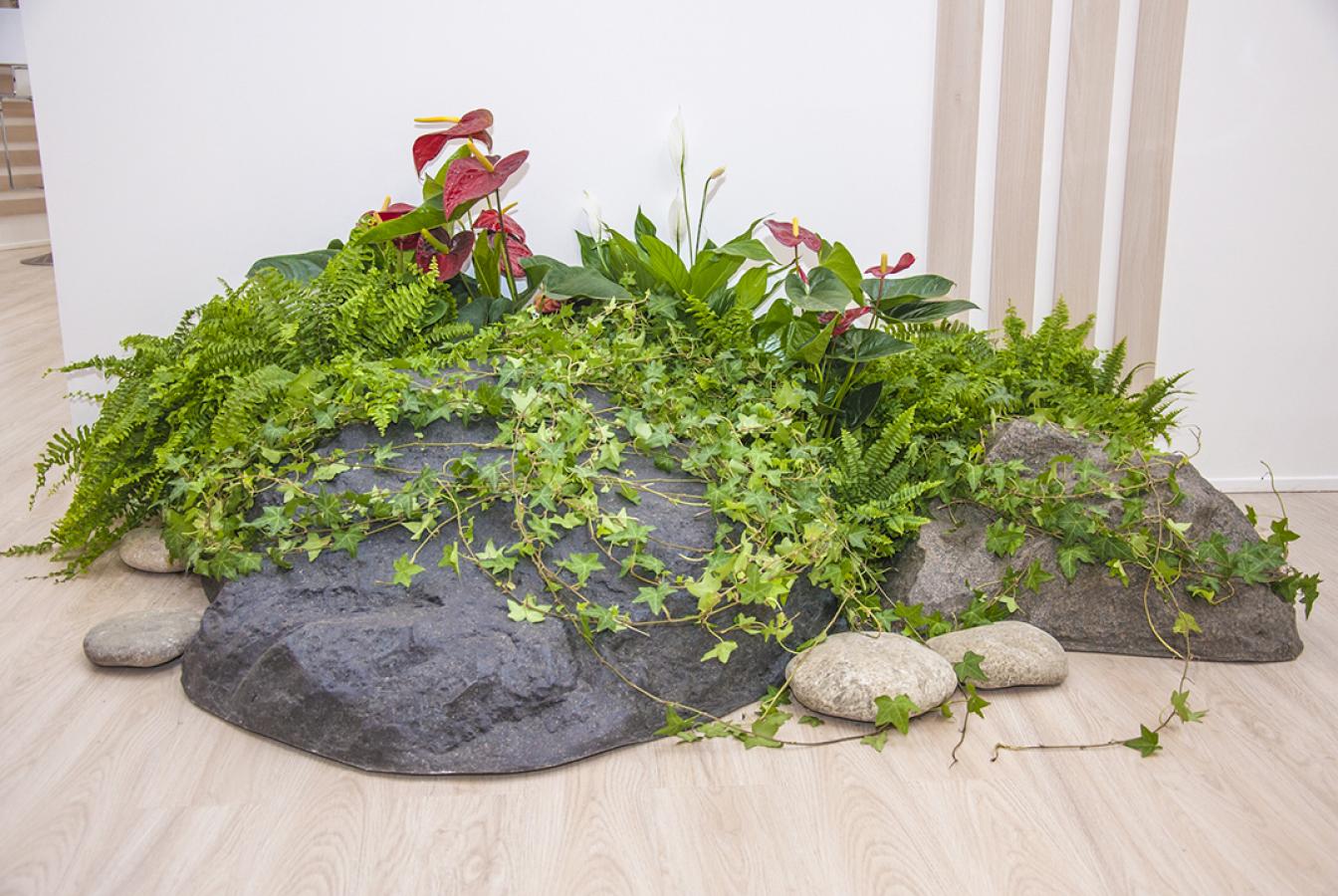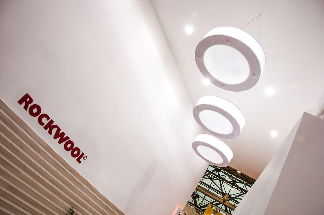 Стенд ROCKWOOL отличали премиальные материалы отделки, мотивы северной природы в флористических оазисах с использованием природных валунов-морен, большие световые логотипы и система авторских светильников, многоуровневая сложная, но функциональная планировка.