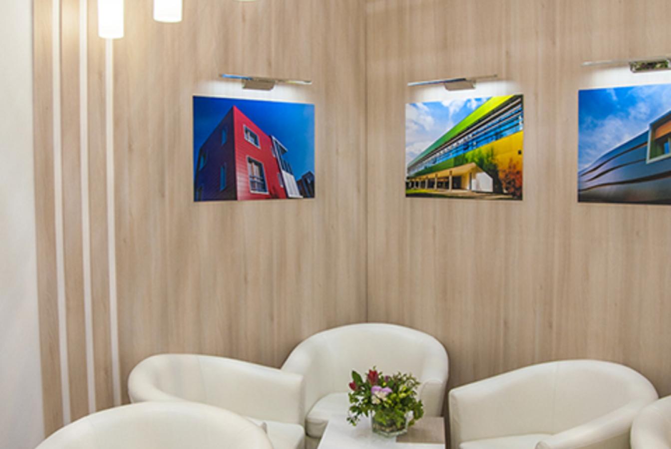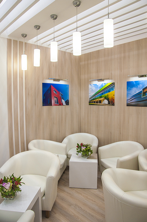 Отделка светлым деревом в скандинавском стиле и локальные геометрически выверенные формы конструктива стенда создавали образ надежной стабильной компании, лидера рынка.