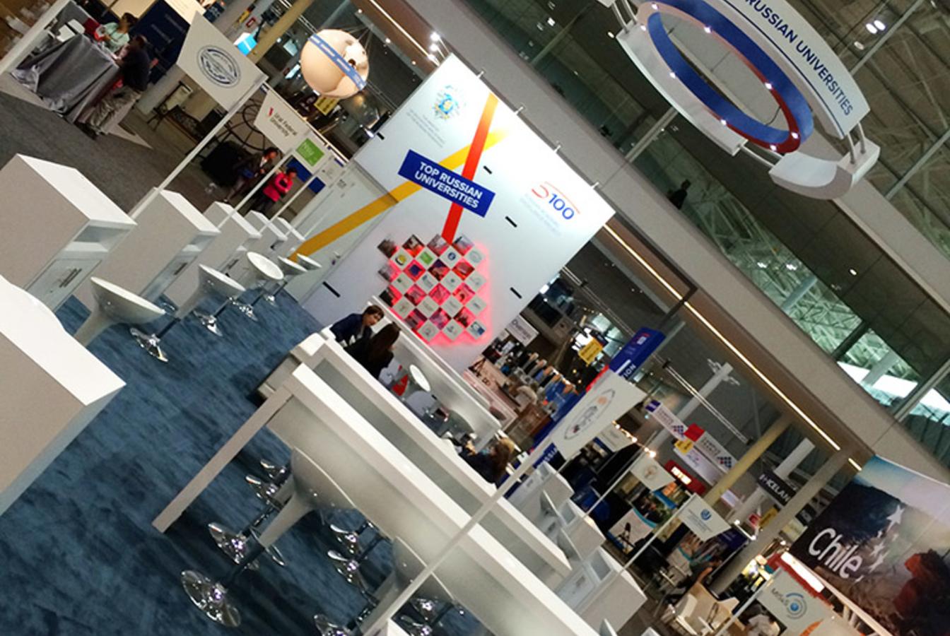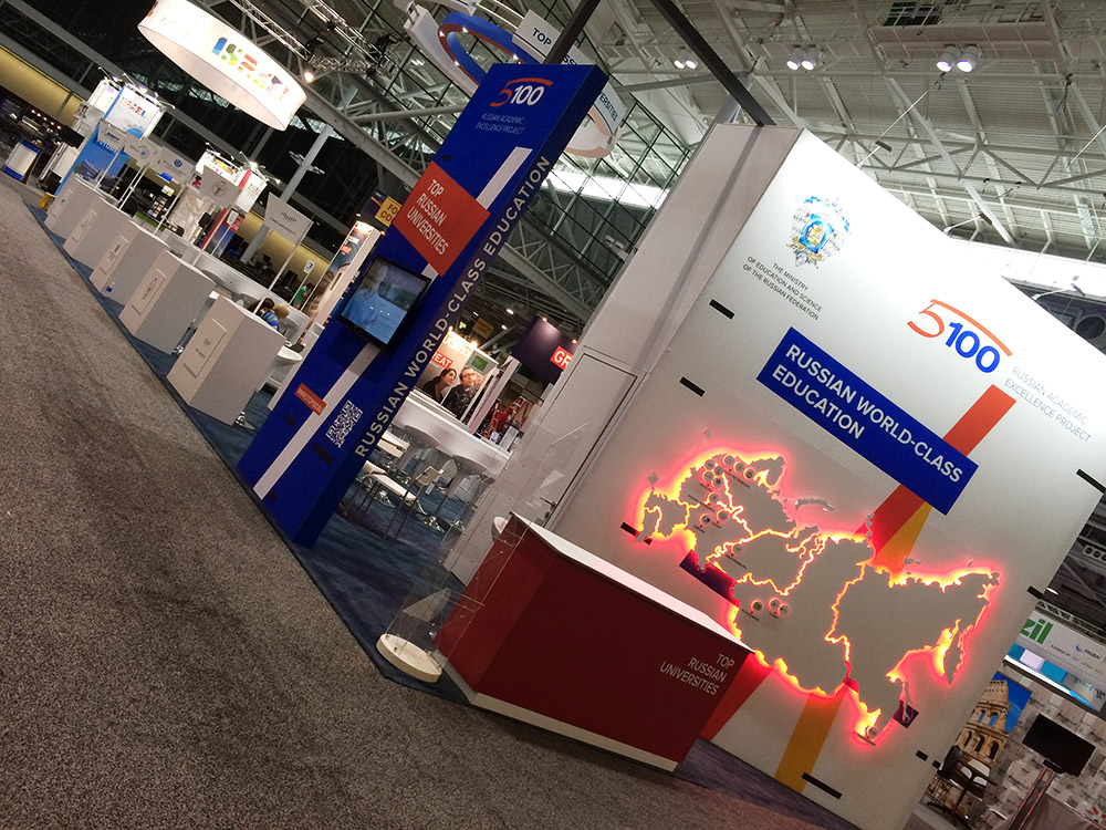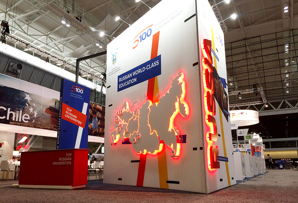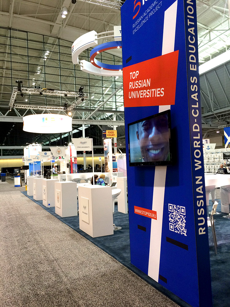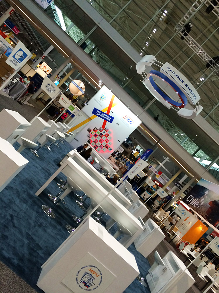 Стенд стал одним из самых ярких на выставке. Среди деталей проекта выделяются масштабная объёмная световая карта с объемными логотипами университетов-участников, объемный логотип во всю высоту торцевой стены, объемный световой коллаж на центральной стене, продуманные рабочие зоны для участников проекта.