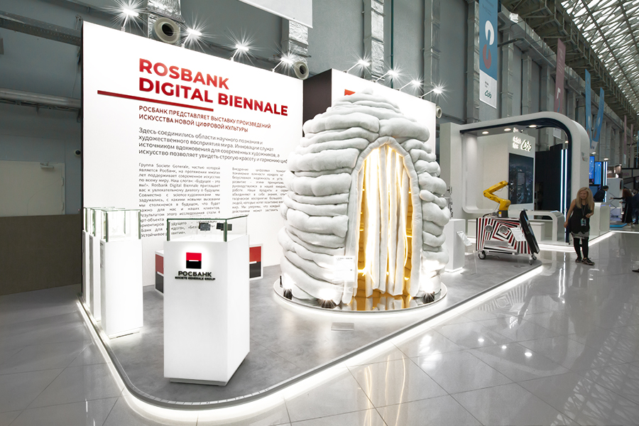 Тематика стенда для Росбанка, воплощенного компанией 4ВИДА, необычна для финансового Форума. Тема стенда - Digital Biennale, выставка современного цифрового искусства в разрезе банковских услуг и технологий.