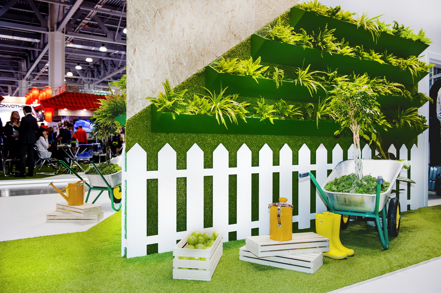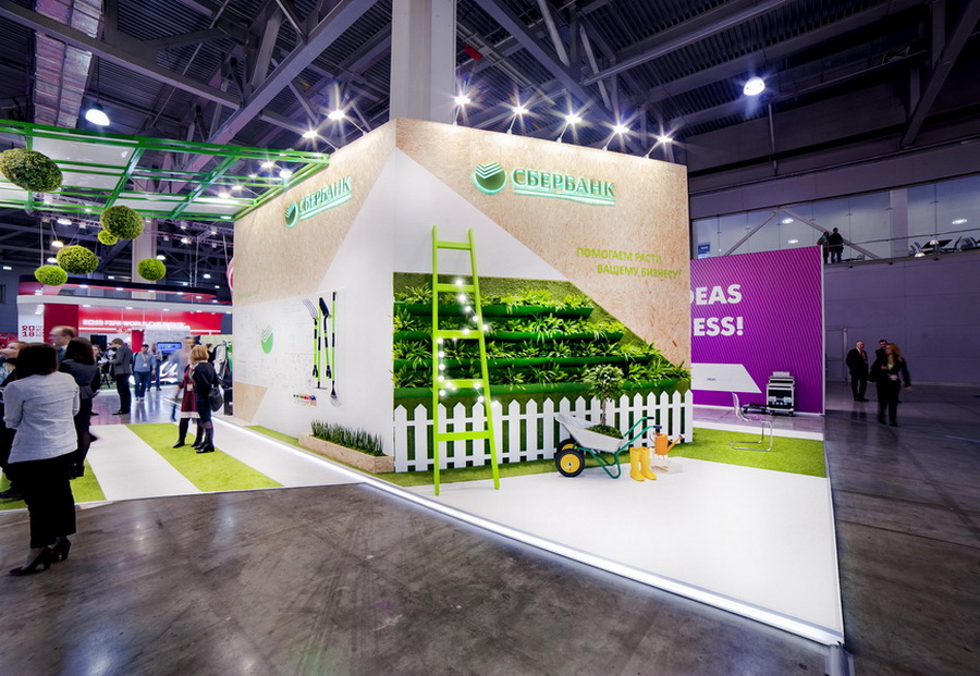 Воплощена идея стенда-теплицы, где создаются отличные условия для роста малого бизнеса. В облицовке стенда использовались черновые ОСБ-материалы, сварные металлоконструкции, недорогой предметный декор и графика, нарисованная вручную.